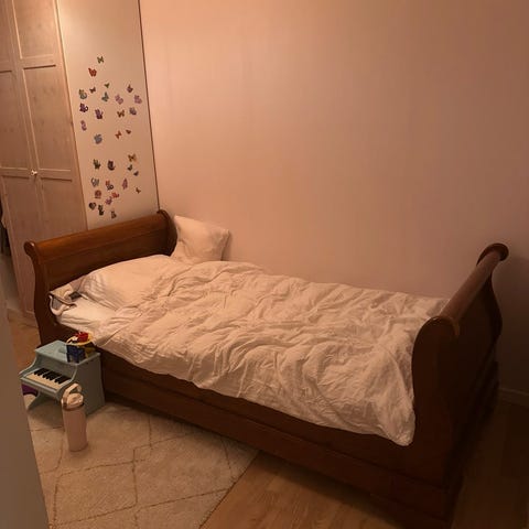 Flot gammel kvalitetsseng i bøg fra Kaagaards Møbelfabrik. Virkelig god stand. Enkelte ridser, se billeder. Perfekt til børneværelse, når man går fra juniorseng til voksenseng eller på gæsteværelset. Passer til madras på 85x200 cm. Siddehøjde: 45 cm.