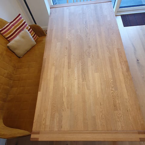 Bordet er solidt, lækkert, tungt og i god stand, kun med enkelte små pletter på bordpladen som nemt kan fjernes med rengøring, en gang brun sæbe eller afslibning, og desuden et lille hak som måler 1,5 cm langt (se sidste billede) - dette er ikke noget man lægger mærke til i dagligdagen. Benene kan (og bør) nemt skrues af til at lette transporten.