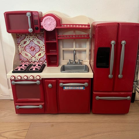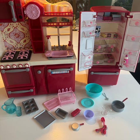 Our generation køkken med køleskab, ovn, opvaskemaskine, vask og en hel masse tilbehør (mad,skåle, glas, gryder, pander, pisker mm)
