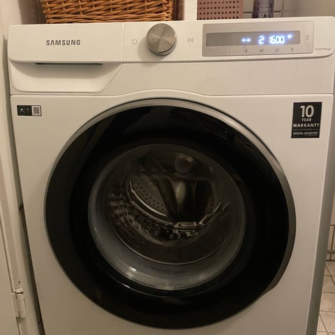 Samsung Frontbetjent vaskemaskine. Maskinen er designet til frontbetjening og har en hvid finish. Velegnet til almindelig tøjvask.