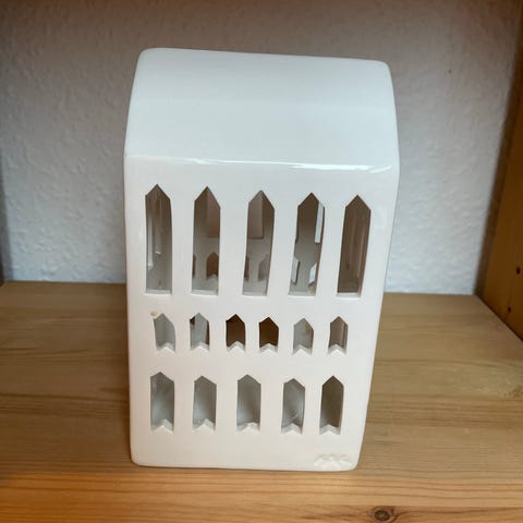 Kähler lysestager i hvid keramik med firkantet design og udskårne firkantede mønstre. Lysestagerne har en moderne stil og kan bruges til dekoration og belysning i hjemmet. Det er den store variant af dem. Der er små ridser i toppen på den ene. Sælges kun samlet og bliver kun sendt på købers regning.