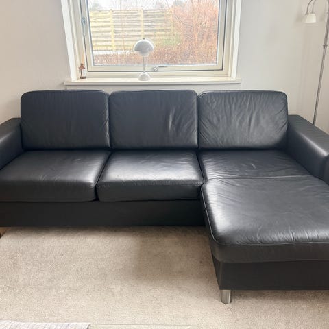 Sælger en stor og rummelig chaiselong-sofa i ægte sort læder. Sofaen er meget behagelig og giver god plads til både afslapning og gæster.