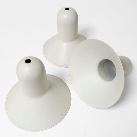 Pendlerne fremstår i fin stand og uden skader i original mat hvid lak, metal, Ø 14 cm med monteret E27 porcelænfatning. Fra ikke-ryger hjem. Lamperne er fremstillet hos Focus Belysning, som er den oprindelige producent - i dag fremstilles de hos Carl Hansen & Søn (pris for sæt a 2 stk. til kr. 2195,00). Prisen er pr. stk.