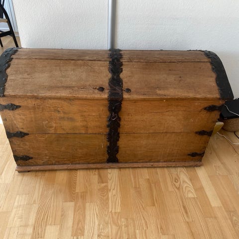 Drag kiste med buet låg i grønmalet træ med røde, dekorative udskæringer. Kisten står på gulv og har beslag og udsmykning hele vejen rundt. Velegnet som opbevaringskiste eller som dekorativt møbel i f.eks. stue, gang eller soveværelse.