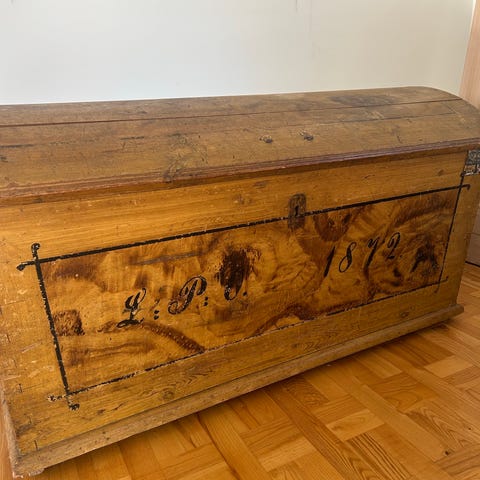 Flot dragkiste (tysk) med buet låg grøn med røde udskæringer
