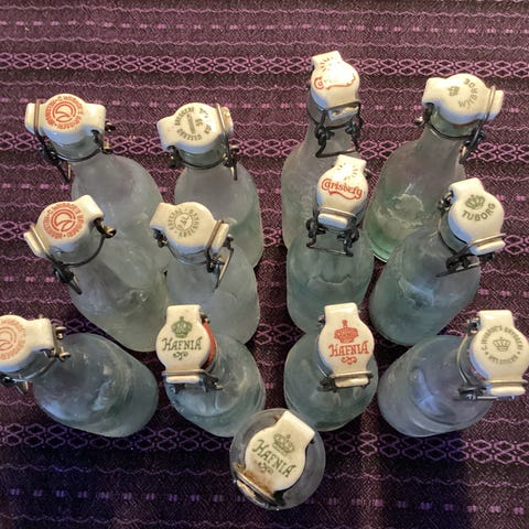 Samling af gamle sodavandsflasker Tuborg, Carlsberg og Vejle med patentlukning.