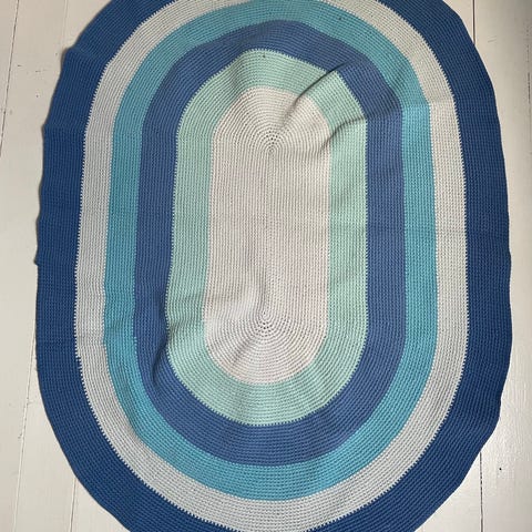 Sebra rundt tæppe fremstillet i flerfarvet bomuld. Tæppet har en diameter på cirka 120 cm og er velegnet til brug som gulvbelægning i forskellige rum.