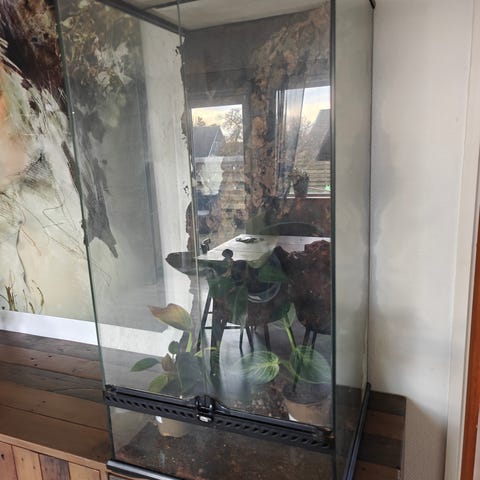 Medfølger i prisen: Terrariet sælges inklusiv en flot fastmonteret baggrund i naturkork, lås samt interiør: