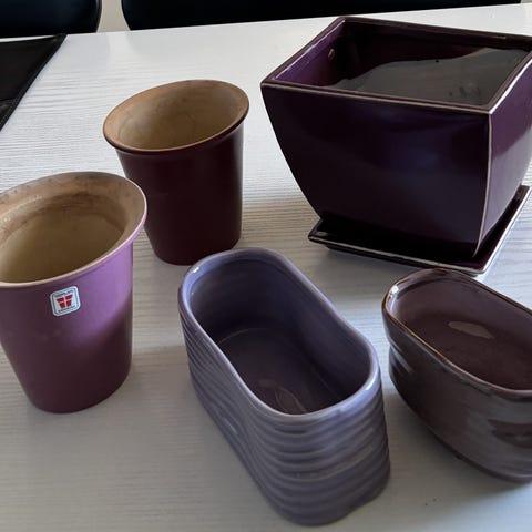 Lidt forskellige urtepotteskjulere, vase, kopper, krukker, blomstersten og opsatser. Til bomster og f.eks. juledekorationer. Samlet pris.