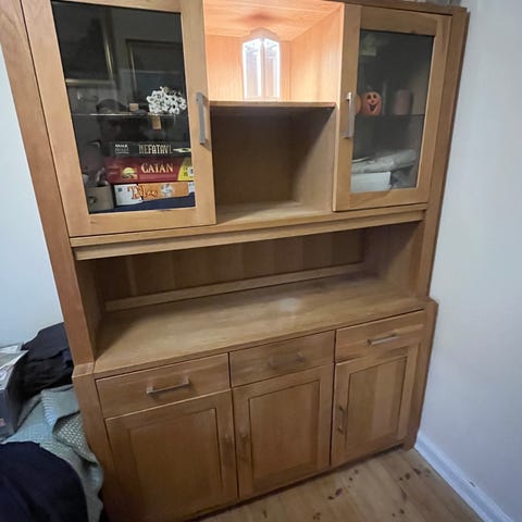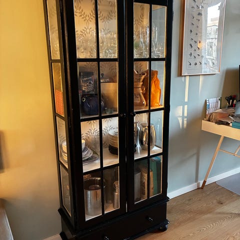 Vitrineskab i træ med skrå sider og en træhylde. Skabet er 80 cm bredt bagtil og 60 cm foran. Højden på 46 cm er inkl. 'blonde'.