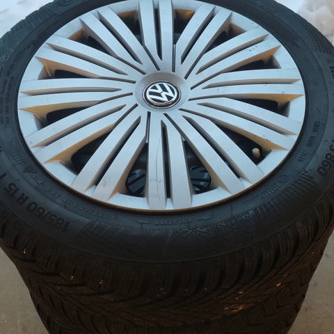 Sæt med 4 stk. Continental WinterContact TS 870 vinterdæk i størrelsen 185/60 R15, monteret på stålfælge med VW hjulkapsler.