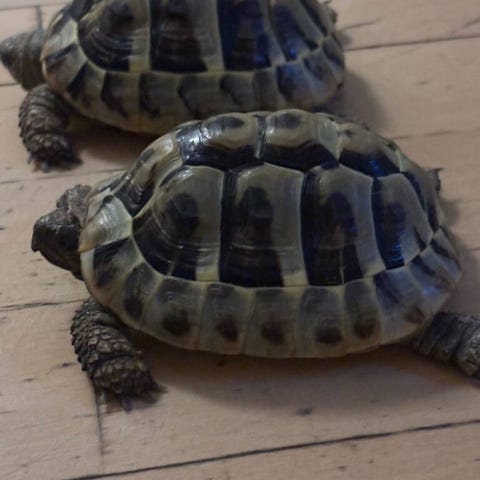To marginata skildpadder begge på 7 år. Har boet sammen i bur i alle årene. Passer og plejet. Mad/vandskål + varmelampe + hjemmelavet bur medfølger. Skal købes samlet. Dokumenter for godkendte vacciner etc.
