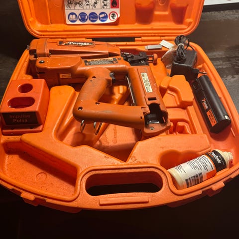 Paslode IM65 F16 sømpistol i orange kuffert. Værktøjet er beregnet til brug med søm og er egnet til forskellige bygge- og reparationsopgaver.