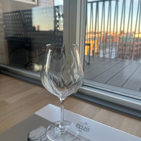 Glassene har en klassisk form med lang stilk og rund skål med lille glasboble på top af stilk.