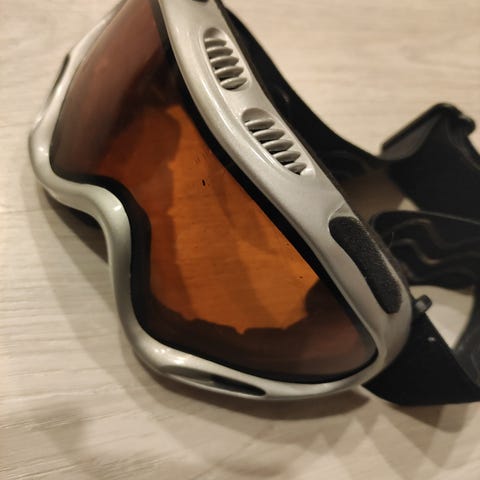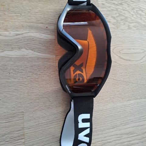 Uvex skibriller med orange linse og stel i sort og hvid. Brillerne har en elastisk strop med Uvex-logo og er designet til at beskytte øjnene mod sne og vind under skiløb.