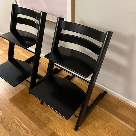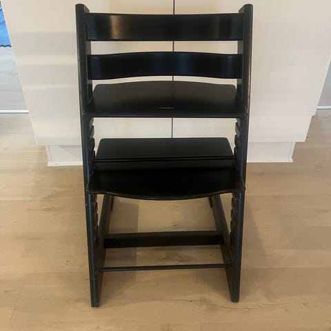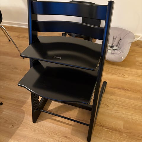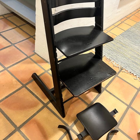 Sort Stokke stol i sort træ med med en n enkelt synlig skade (kan fint males over med sort maling).