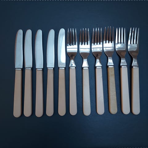 Bestik, rustfrit stål import, ukendt, 6 stk retro knive i rustfrit stål har ikke været brugt de sidste 18 år -- kommer fra et ikke ryger hjem -- sælges helst som et samlet lot --- ellers 10,00 kr pr kniv -- kniven er 20 cm lang