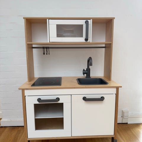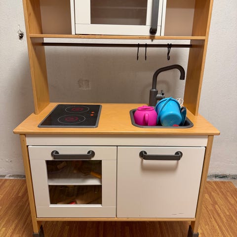IKEA børnekøkken i træ med ovn, vask og kogeplader. Køkkenet har en mikrobølgeovn med gennemsigtigt vindue, en vask med hane samt to kogeplader med røde markeringer. Køkkenet er primært i naturfarvet træ og hvidt med sorte håndtag.