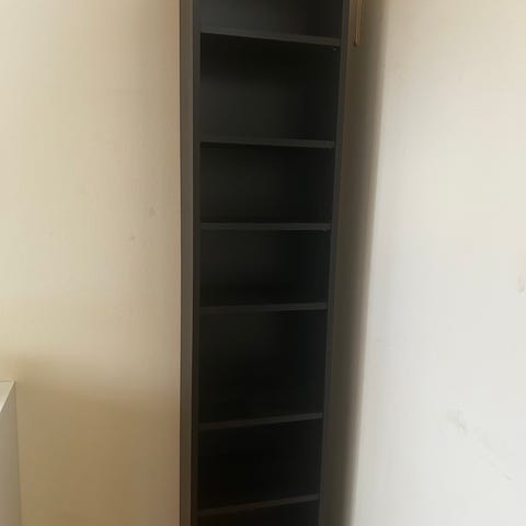 En stor, flot reol, som vi har overtaget i forbindelse med et flyt til plejehjem. Men vi har måttet opgive at få den op i vores søns lejlighed.