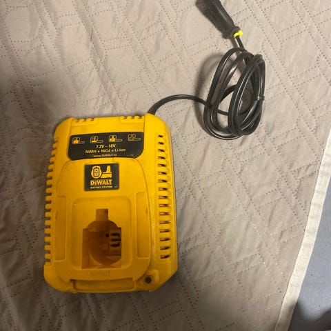 DeWalt batterioplader til 3 batterier i gul farve. Designet til opladning af flere batterier samtidig, egnet til brug med DeWalt batterier.