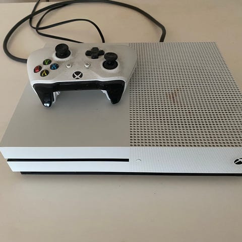 Xbox Series S konsol i hvid med to trådløse controllere i hvid og sort/hvid farve. Medfølger spillet Just Dance 2021 til Xbox One. Konsollen har flere porte på bagsiden til tilslutning af eksternt udstyr.
