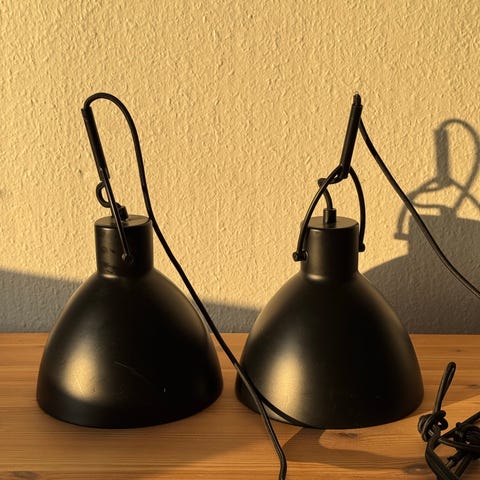 Sorte pendler / loftslamper med rød stofledning (kan udskiftes).