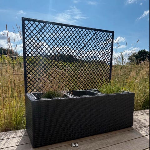 Plantekasse med to indvendige potter og et gitter i sort fletmateriale.