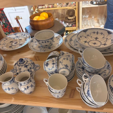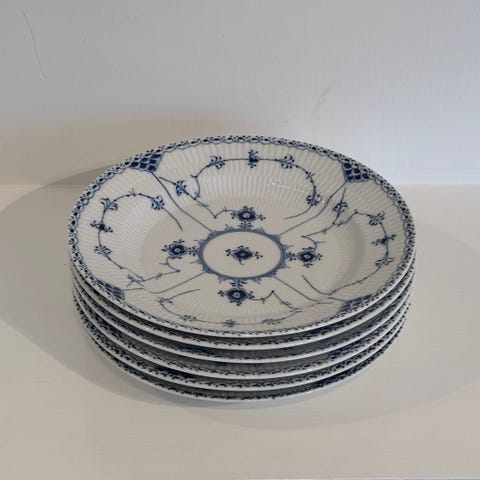 Stor og meget flot samling af Royal Copenhagen Musselmalet Halvblonde, hovedsageligt i 1. sortering, designet af Arnold Krog. Samlingen spænder over både tallerkener, kaffestel og serveringsdele – produceret fra ca. 1870 og helt op i 1990’erne.