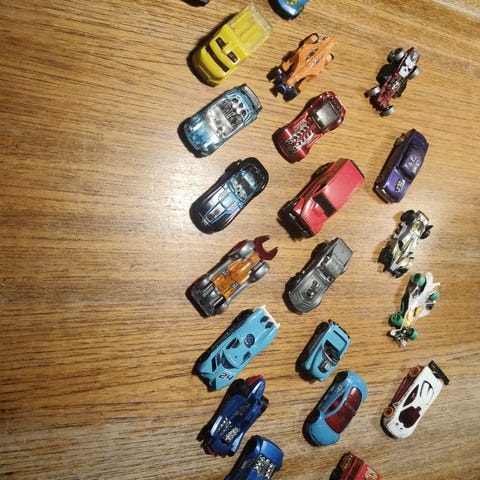 Ca 70 mini biler og 10 lidt større biler samt lidt fly og lastbiler. Kommer i to transport æsker. Et par af bilerne er hot wheels. Køb det hele og sælg dem om 2 år for det dobbelte 😀.
