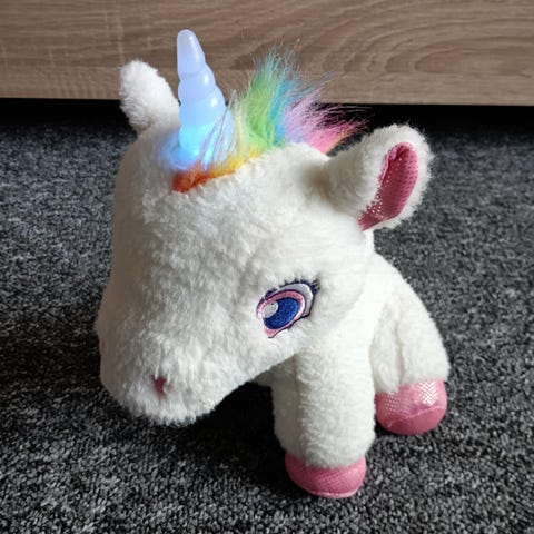 Enhjørning laver hyggelyde og hornet lyser i forskellige farver