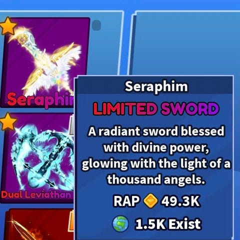 Serpent Limited Sword til spil med egenskaber som en majestætisk, coilende skabning med stor kraft og ynde. Produktet har en RAP-værdi på 23.4K og findes i 1.000 eksemplarer.
