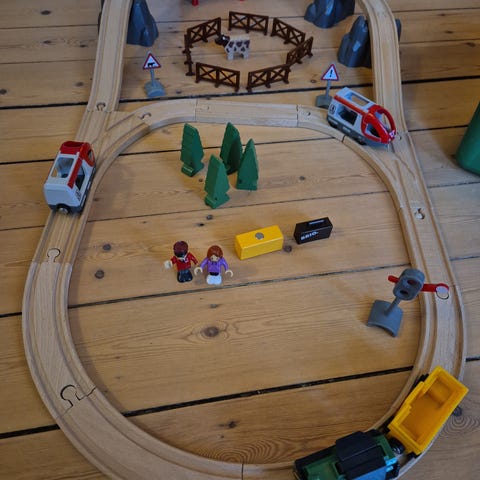 Der er en dinosaur på banen i dette BRIO-togsæt! Brio World-sættet kommer i 12 dele og inkluderer et lokomotiv med vogn, en brachiosaurus-dinosaurfigur, togspordele og tilbehør. Togsporet kan bygges som en cirkel, men det er en god idé at sætte farten ned, når toget nærmer sig krydset med træet, for den farverige dinosaur elsker at strække halsen mod bladene i toppen. Dino-figurens hoved har en magnet i sig til at få fat i græstilbehøret, og ved hjælp af halen kan børn hæve og sænke dinoens hoved.