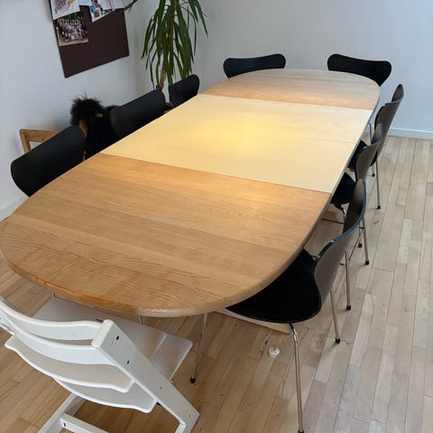 Under slibning, fandt vi ud af at tillægspladerne ikke er massive. Derfor fremstår bordet nu delvist slebet og er grunden til at det er gratis