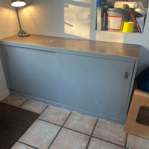 Istandsat TV-skænk der nu er en perfekt skobænk til den større entré. Er malet for et par år siden, isat ekstra hylder til sko og så har vi fået specialdesignet en læderhynde i de rette mål. Højde er inkl puden.
