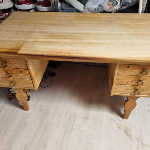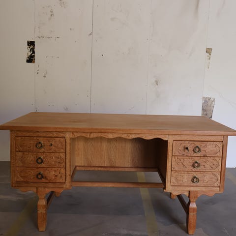 Skrivebord egetræ Henning Kjærnulf stil skrivebordet har 3 skuffer samt boghylde på bagsiden har almindelige aldersrelateret brugsspor længde 150 cm bredde 75 cm højde 72 cm Mulighed for levering til kantsten gadeplan I København eller nærmeste omegn for 100kr