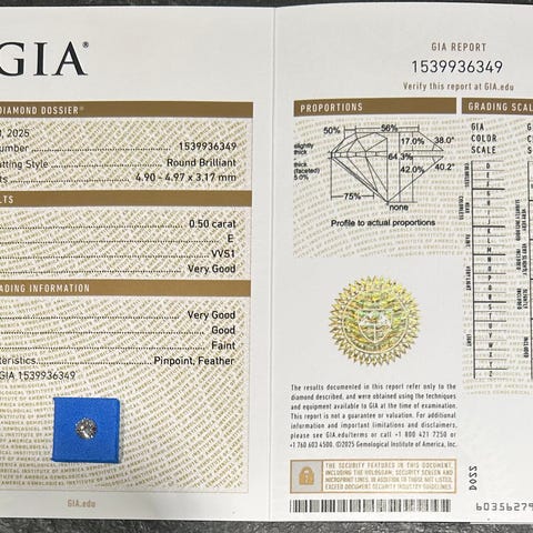 Løs rund GIA certificeret diamant. 0.53 ct. Farve River E klarhed VVS1. Excellent cut grade, polish og symmetry.