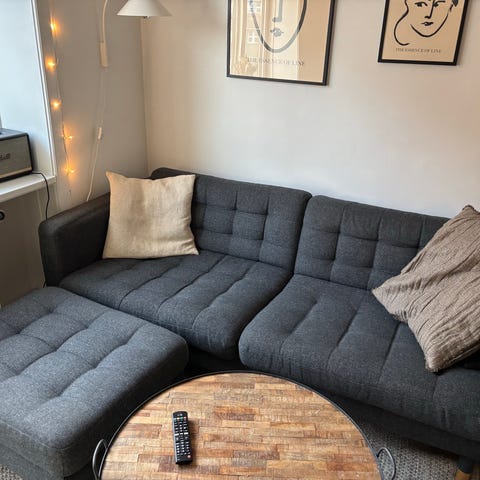 Puf/taburet i mørk grå stof med krom ben. Passer til Landskrona sofaen. Brugt men fremstår næsten som ny. Nypris 1.900,-