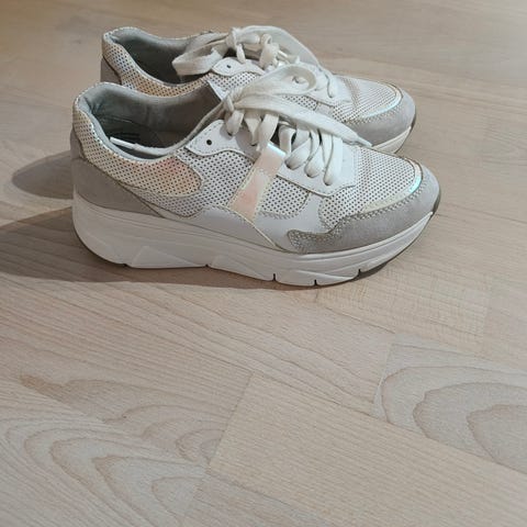 Tamaris sneakers i størrelse 41. Skoene har snørebånd og en lav profil. Farven fremstår som lys metallic. Velegnet til daglig brug.