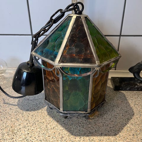 Charmerende lampe i glas og forgyldt metal. Højden er 45 cm medtages kæde og roset er den 60 cm.