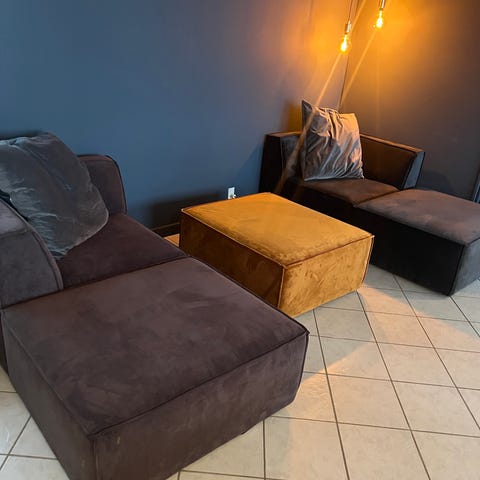 Den trænger til en rens, og der er nogle huller i stoffet under sofaen (har hverken funktionel eller æstetisk betydning)