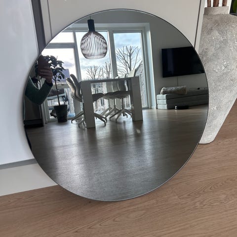 Fint pænt spejl fra House Doctor 47/ 56,6 cm. Der er beslag så det kan hænge lodret og vandret. Flot og pæn stand med alm brugsspor. Der er en guldkant på spejlet og ellers sort.