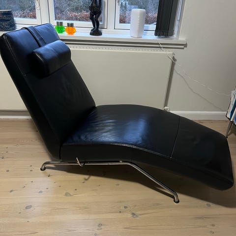 Cosmo chaiselong stol fra Ilva, i smukt mørkebrunt skind, Justerbart ryglæn. Måler 180 cm i længden, når ryglænet er lagt ned og 63 cm i bredden.