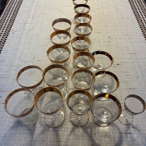 Glassene har en bred guldkant med et ciseleret (mønstret) bånd.