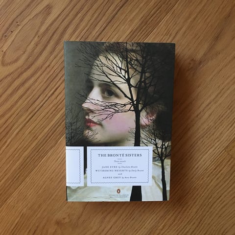 The Bronte Sisters Three Novels bog indeholder Jane Eyre af Charlotte Brontë, Wuthering Heights af Emily Brontë og Agnes Grey af Anne Brontë. Bogen har en dekorativ forside med blomsterdesign.