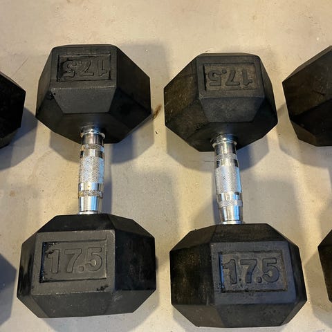 Sæt bestående af 2 x 20 kg hexagonale dumbbells med metalhåndtag og gummibelagte vægte.