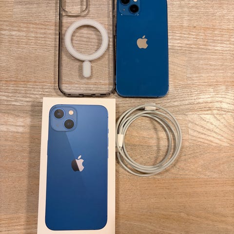Apple iPhone 13 smartphone med 128 GB lagerplads i blå farve. Kun brugt på arbejde. Uden fejl. Der er stadig garanti på til 11 feb 2027