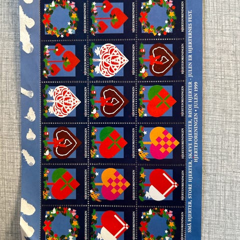Der er 10 hele ark (heraf 3 ens fra SOS-Børnebyerne og 1 som måske er kommercielt) + et brudt fra Hjerteforeningen - disse sælges samlet kr. 150,-.