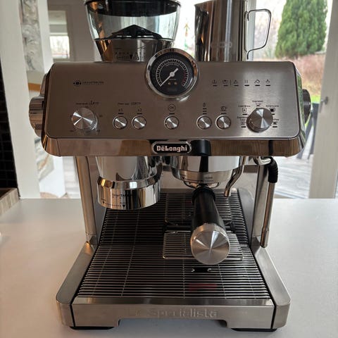 DeLonghi La Specialista Prestigio espressomaskine i rustfrit stål sælges, da nogen i husstanden hellere vil have en fuldautomatisk. Maskinen har maks. brygget 40 kopper (den har stået i vores sommerhus) og der er kun brugt kildevand. Alt udstyr medfølger undtaget original emballage.