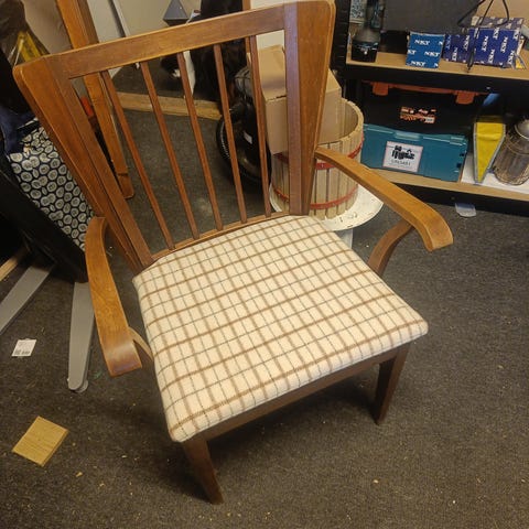Flot gammel lænestol med udskæringer fortil. Betræk fra Laura Ashley. Man sidder godt i den 😊