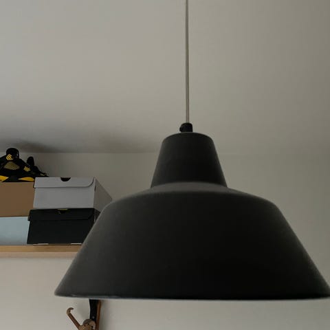 Isblå værkstedslampe fra Louis Poulsen i god stand. Ledning og fatning medfølger.
